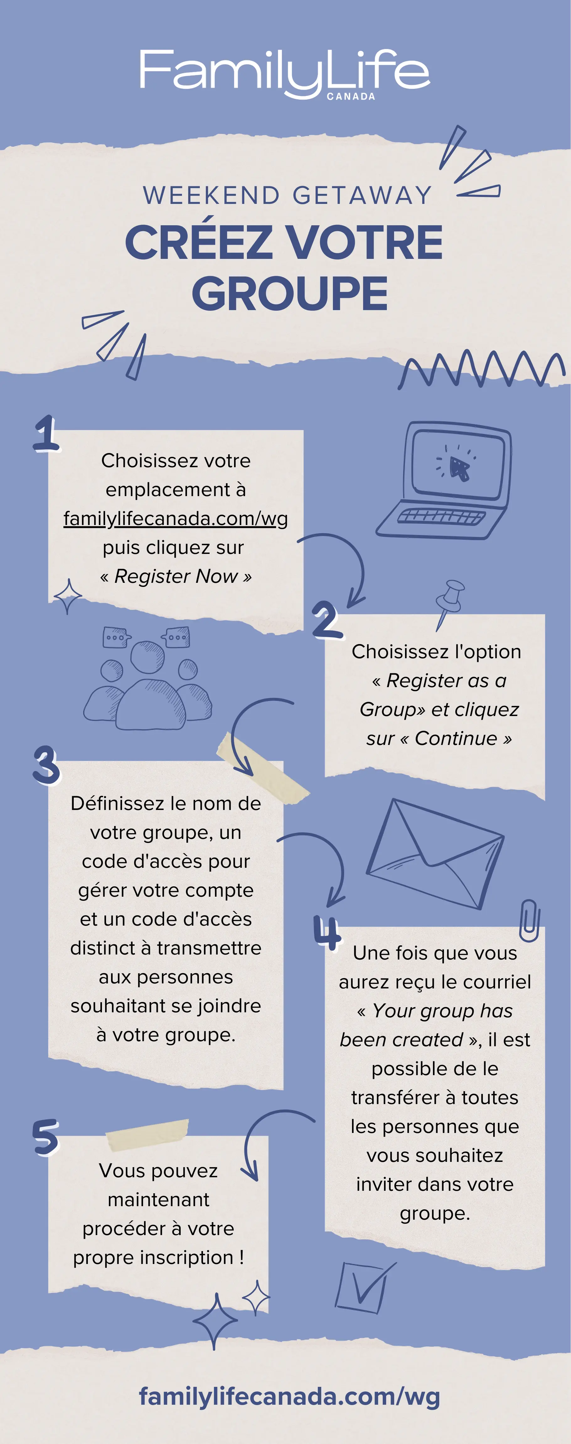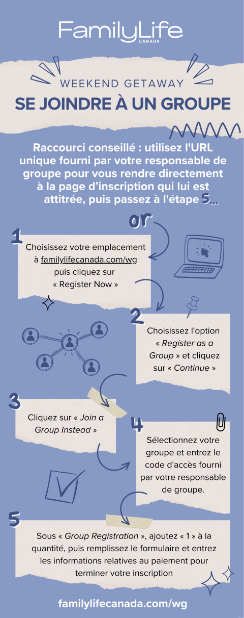 Vous pouvez également transformer vos inscriptions en inscriptions à tarif préférentiel. Si vous avez des questions concernant l’inscription de votre groupe, veuillez envoyer un courriel à events@familylifecanada.com pour obtenir des précisions.
