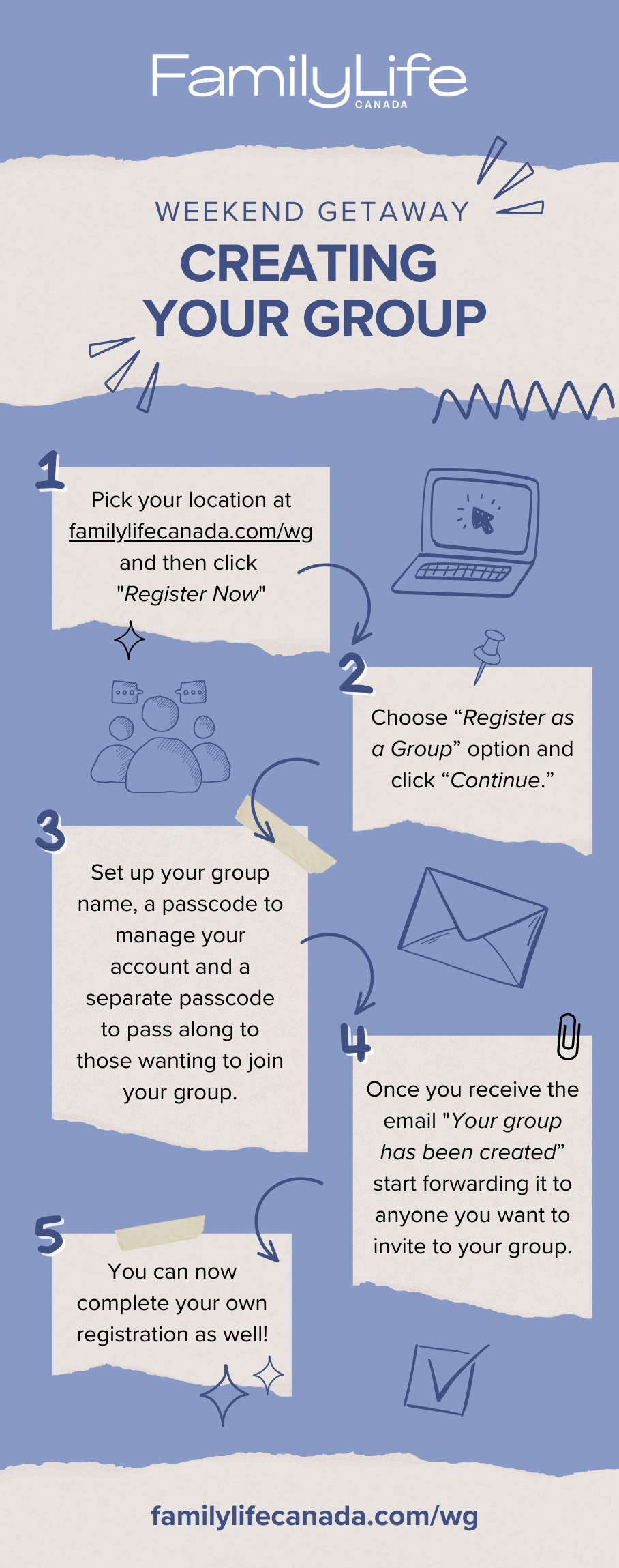 Group members need to be registered at a minimum of two days before the conference. However, we recommend initiating your group in our registration system a few months ahead so that you can forward the registration-link email to invite couples and spread the word in your church community.
